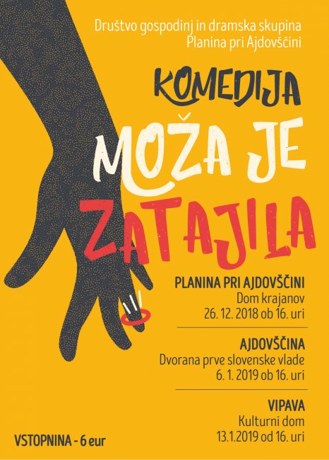 OB 16. URI - komedija MOŽA JE ZATAJILA Prav vaša podpora in podpora vseh, ki naše prireditve zapuščate nasmejani, je vzpodbuda, da z delom nadaljujemo. Zato vas v nedeljo, 6. 1. 2019, ob 16. uri, vabimo v Dvorano prve slovenske vlade v Ajdovščini na ogled komedije MOŽA JE ZATAJILA! Je gospodinja s Planine res zatajila moža? Zakaj? In pred kom? Spomnili pa se bomo tudi časov, ko so naše stare mame z jerbasi na glavi proti Trstu nosile maslo, jajca, kokoši in žganje, da bi zaslužile nekaj lir in s tem omogočile boljše življenje svoji družini. Imenovali so jih "brangerce". Pevski zbor Društva se bo letos - pod vodstvom Janje Pirnar - predstavil z ljubezenskimi napevi. Vstopnina 6 evrov. Društvo gospodinj in dramska skupina Planina pri Ajdovščini že 14 let uspešno skrbi za ohranjanje kulture in tradicije na Vipavskem.