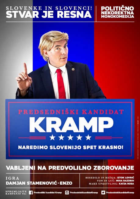 Žgečkljiva zabavna gledališka komedija, ki skozi lik edinega protagonista homorno in hudomušno komentira domače in globalno družbene politične razmere ter čas v katerem živimo. Kot razkriva že naslov, je junak predstave predsedniški kandidat, ki s svojim neposrednim pristopom, političnimi stališči, provokativnimi in kontroverznimi zamislimi in nenazadnje tudi s svojim videzom močno spominja na aktualnega predsednika ZDA. Dramsko besedilo: Iztok Lovrič Igra: Damjan Stamenkovič - Enzo